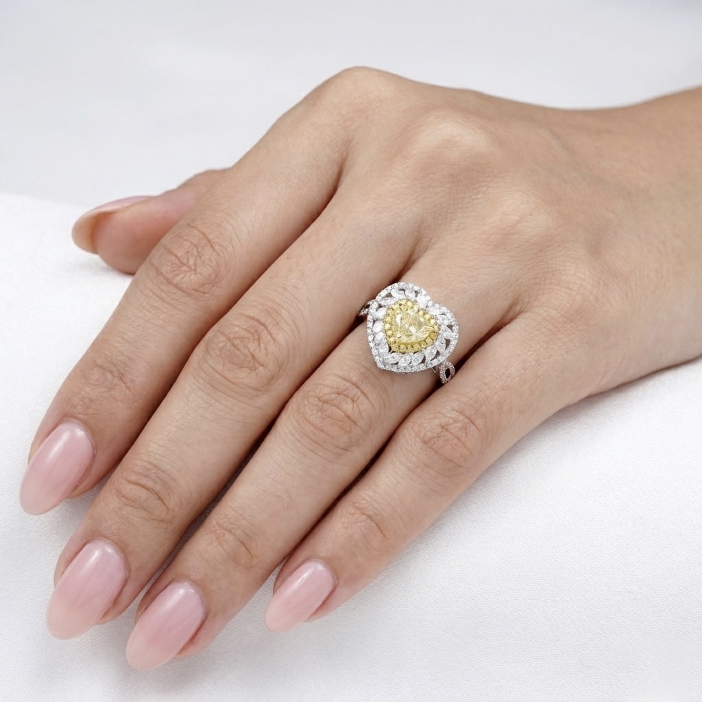 Radiating warmth and brilliance, this captivating ring features a luminous heart-shaped yellow diamond at its centre, framed by a halo of sparkling white diamonds that enhance its light and romantic beauty. Set in polished 18K white gold, the elegant design blends refined craftsmanship with timeless charm, creating a meaningful piece destined to be cherished for life’s most unforgettable moments.