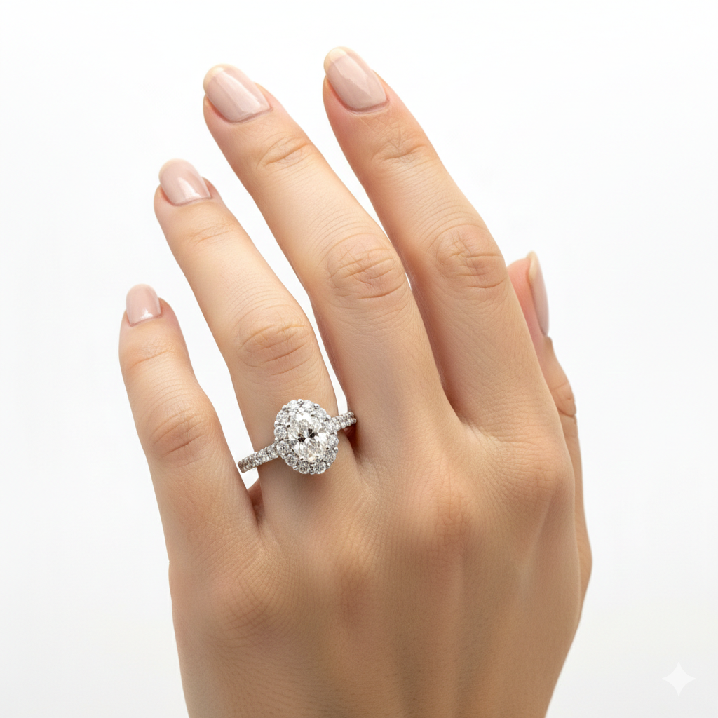 Crafted in luxurious PT950 platinum, this exquisite ring features a captivating oval-cut lab-grown diamond centre stone, surrounded by a delicate halo of shimmering diamonds that enhance its size and brilliance. The diamond-set band adds an extra layer of sparkle, creating a graceful and sophisticated piece that captures light beautifully from every angle. Elegant and timeless, this ring is a stunning choice for engagements or a symbol of lasting love.
