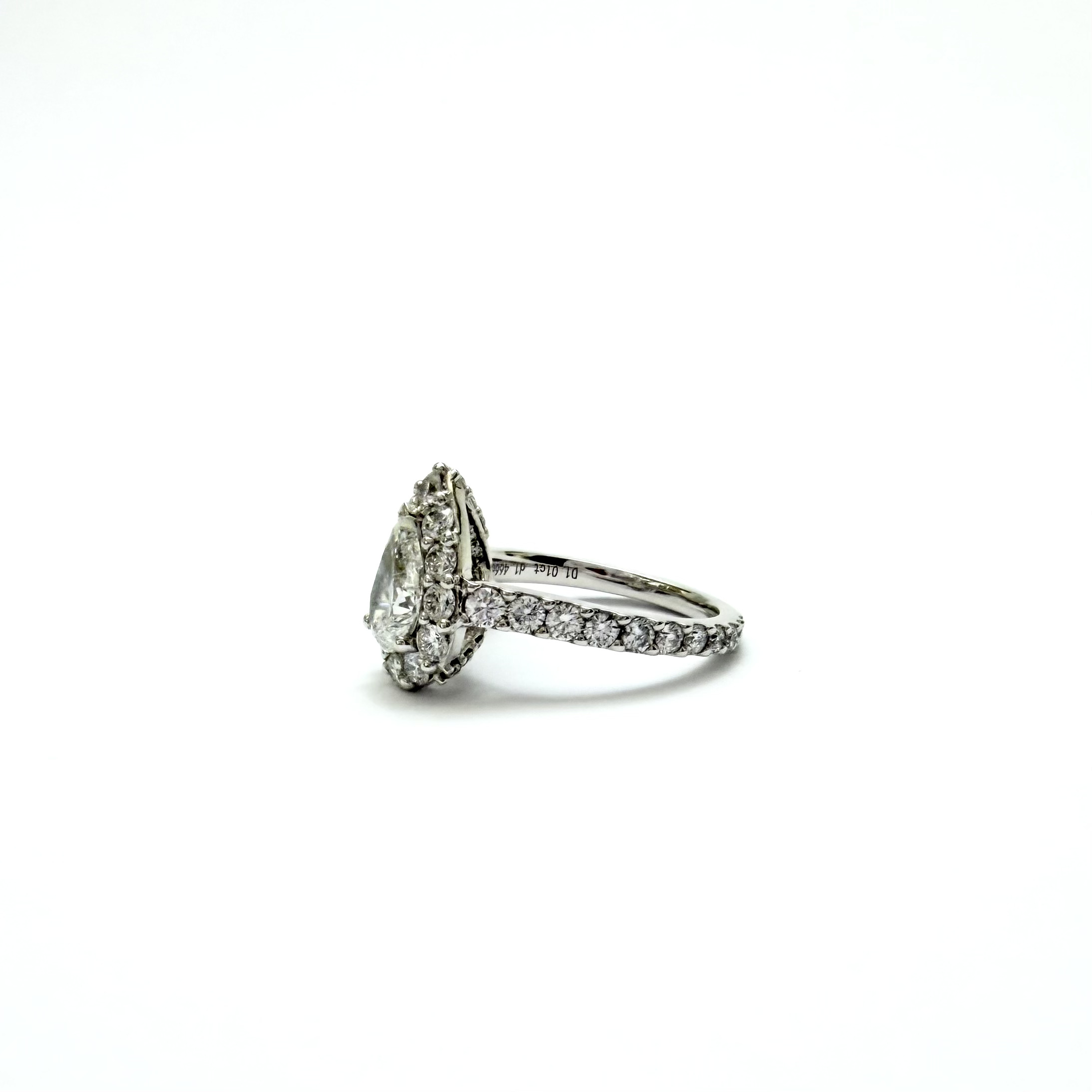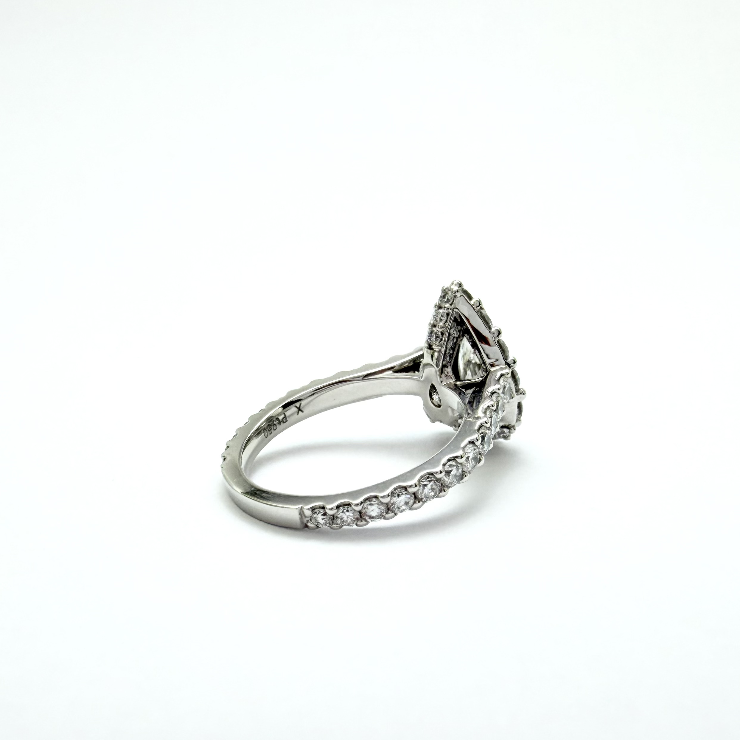 Crafted in luxurious PT950 platinum, this sophisticated ring features a stunning pear-shaped lab-grown diamond centre stone, gracefully framed by a halo of shimmering diamonds. Additional diamonds along the band enhance the sparkle, creating a radiant display of light from every angle. Elegant and captivating, this piece beautifully combines classic design with modern craftsmanship—perfect for engagements or a statement of enduring luxury.