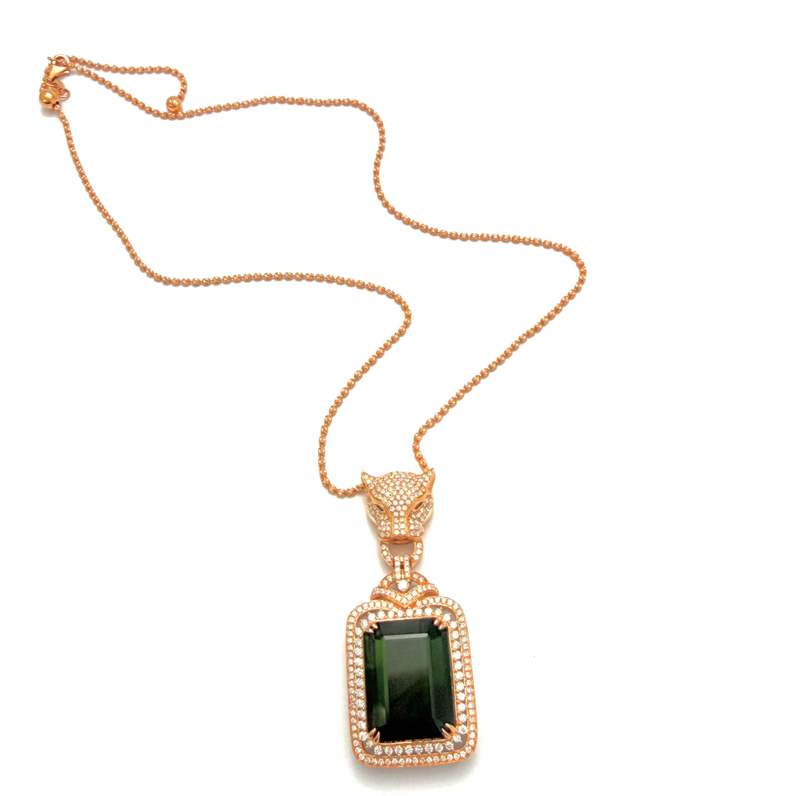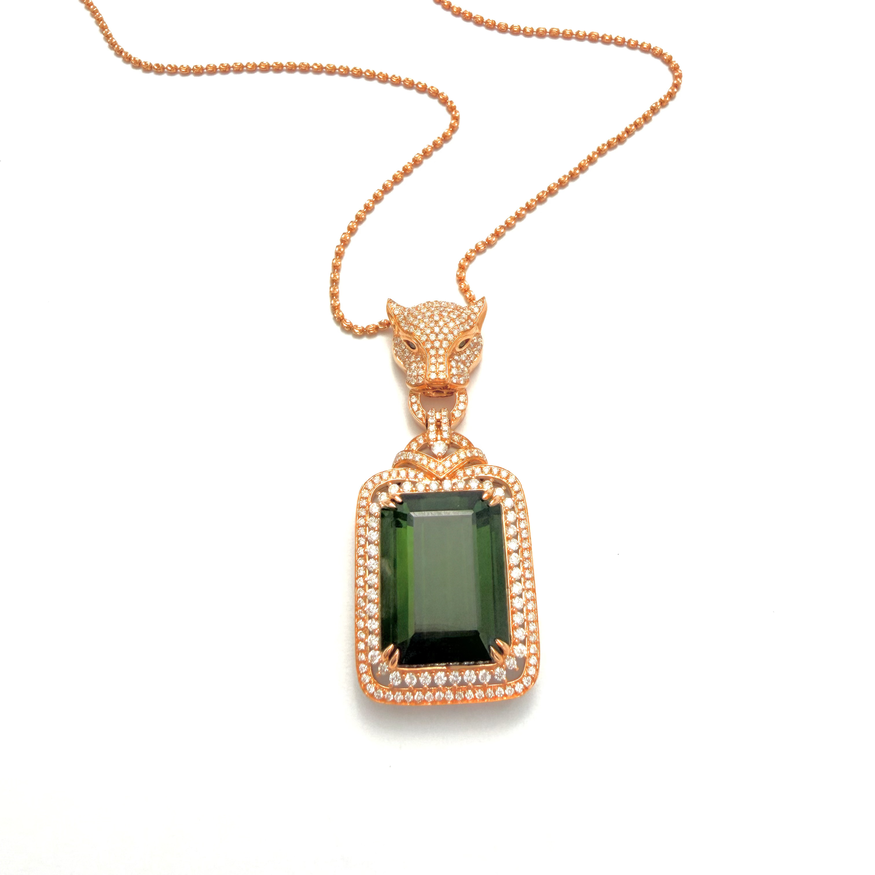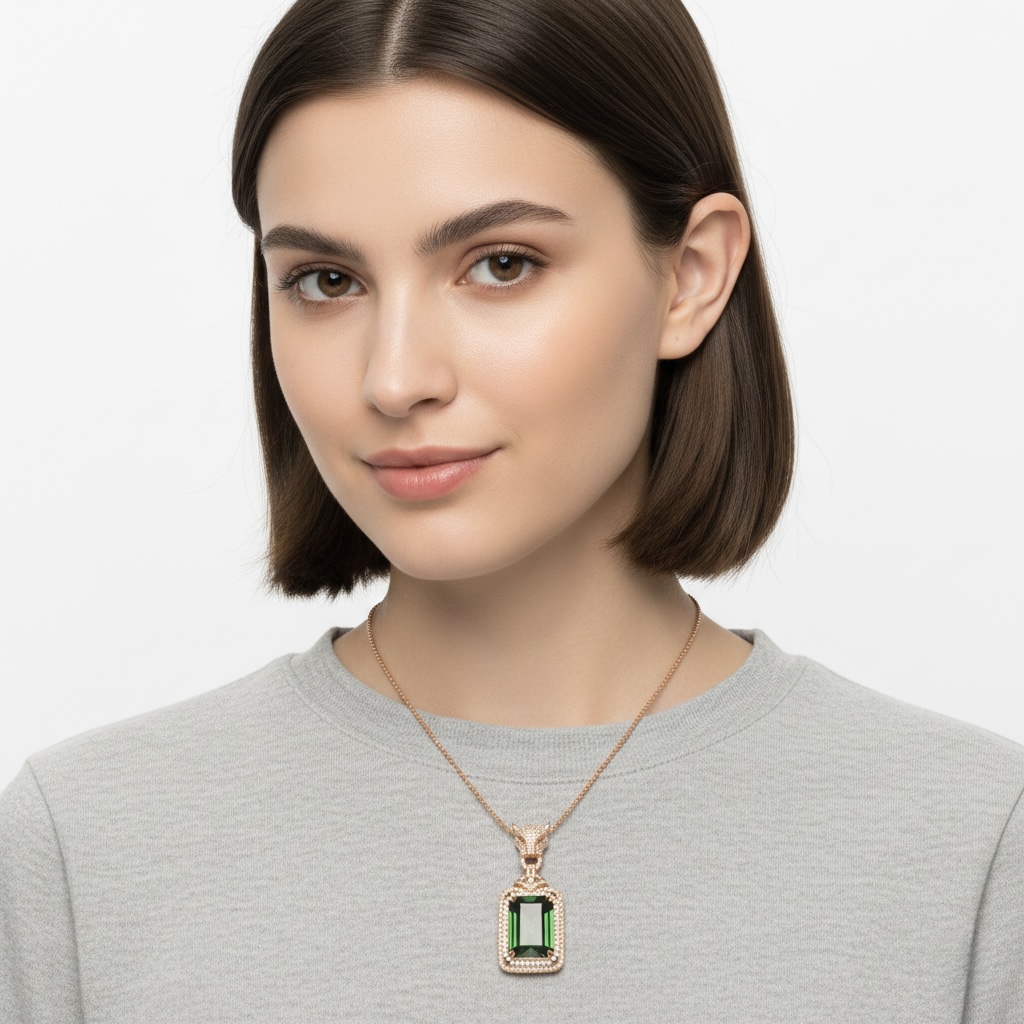 At its heart sits an impressive 29.30 carat emerald-cut green tourmaline — a gemstone prized for its depth, saturation, and natural brilliance. Its bold presence is elevated by a meticulously pavé-set diamond halo, where hundreds of finely set diamonds create an uninterrupted field of light, amplifying the richness of the centre stone from every angle. Crafted in solid 18K gold, the pendant is finished with a sculptural, diamond-set bale that adds both elegance and strength, allowing the piece to sit perfectly on the neckline. Every detail is engineered to feel substantial yet refined — a hallmark of true high jewellery.