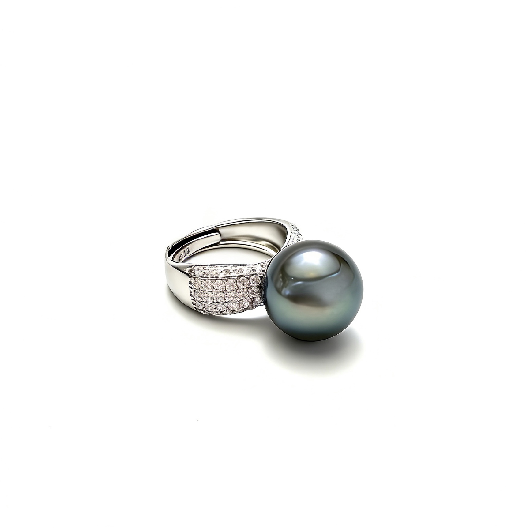 This statement ring showcases a luminous 12-14mm Tahitian pearl in a captivating platinum grey tone, celebrated for its natural depth and mirror-like lustre. The pearl's neary round silhouette enhances radiance, reflecting light with every movement. The band is beautifully detailed with shimmering accents that adds brilliance without overpowering the pearls natural beauty. The design balances strength and feminity.