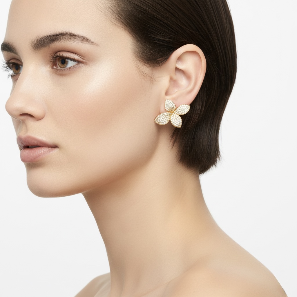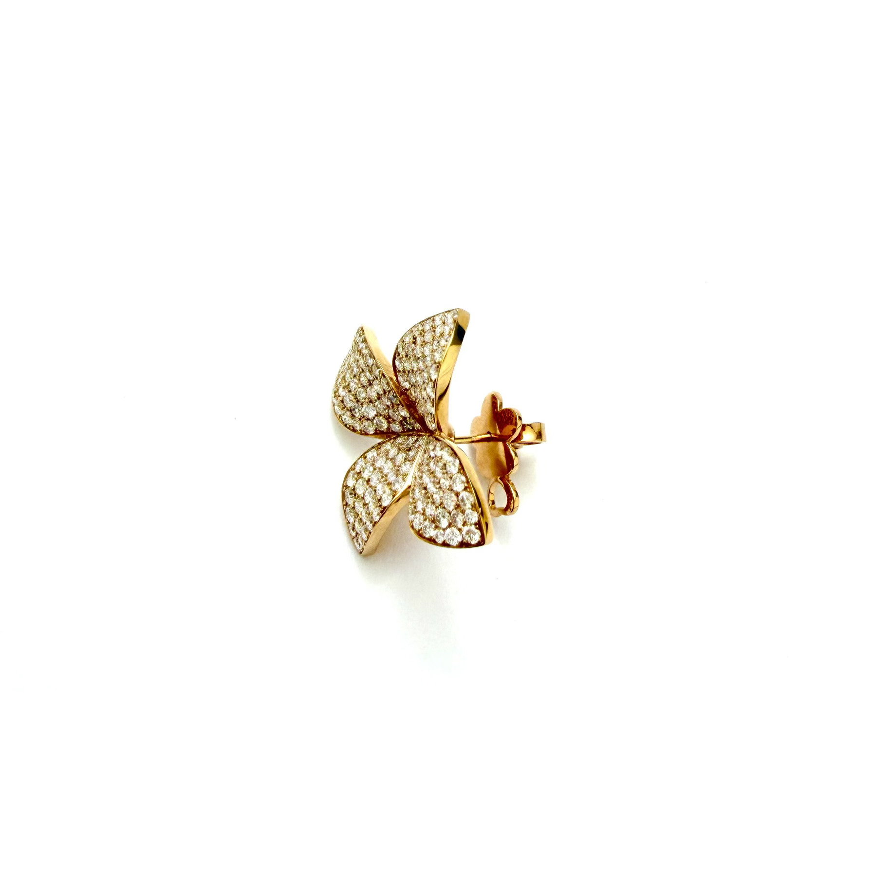 These sculpted floral stud earrings are crafted in 18k rose gold and set with an array of shimmering lab-grown diamonds. Each petal pave-set to capture light and reflect light from every angle, creating a luminous, dimensional finish. The warm tone of rose gold enhances the radiance of the diamonds, giving softness while maintaining strength and structure.