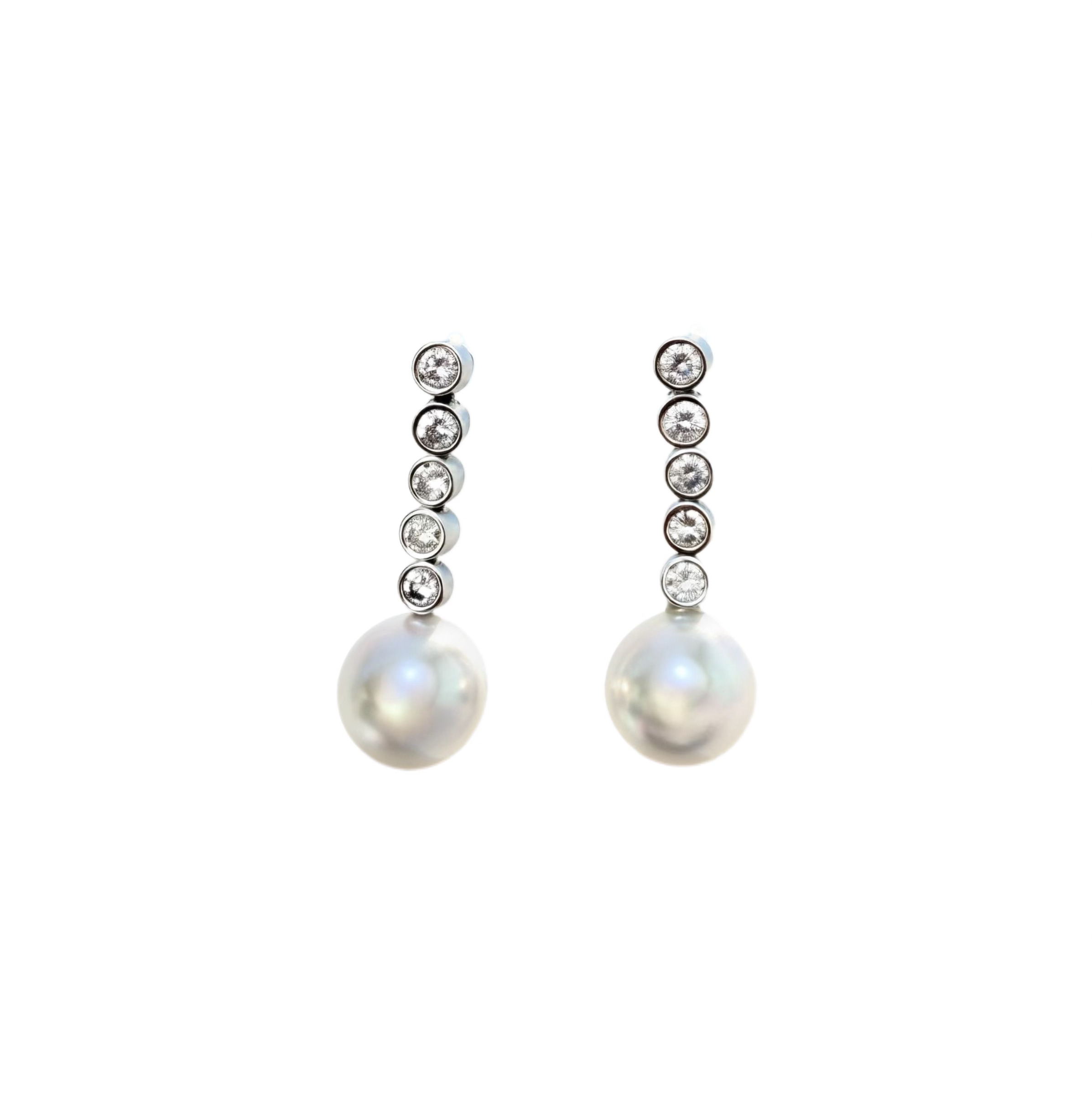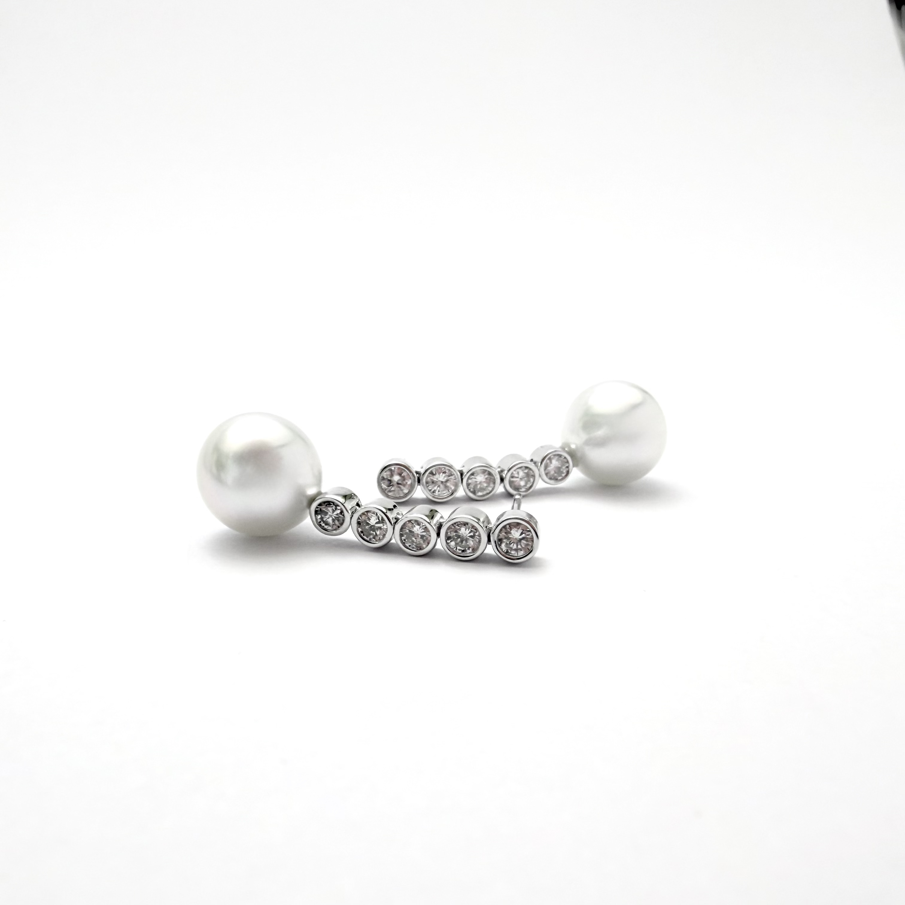 Each pearl is from Australia's sea's selected for its smooth white surface and exceptional lustre. The Diamond setting are individually placed in a bezel setting to create balance, brilliance and fluid movement. Refined construction ensures lasting beauty and everyday wearability.