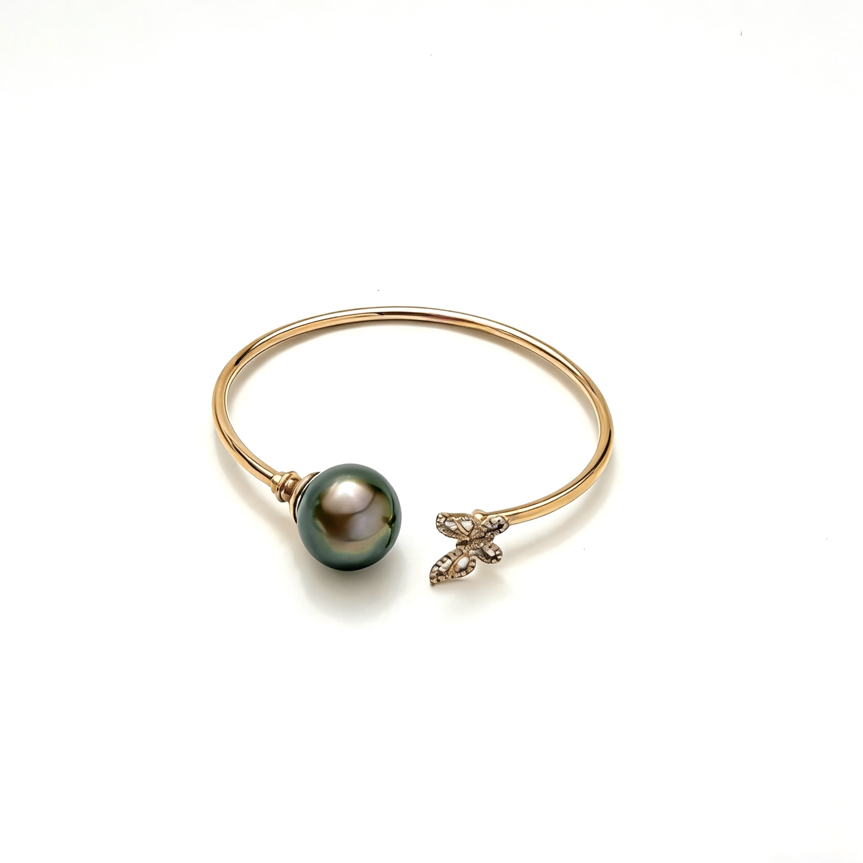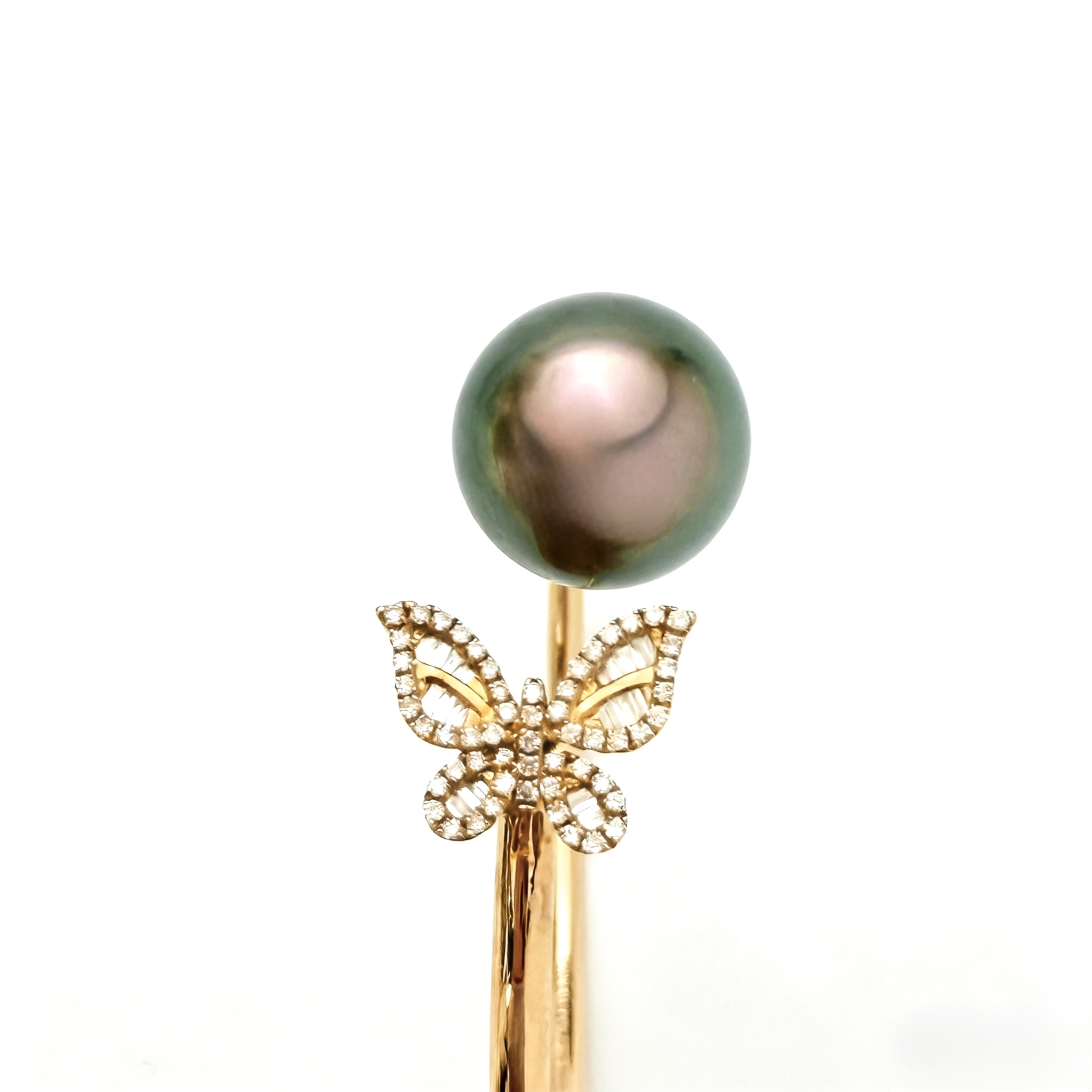 18K Gold, Centred with our specially selected luminous peacock green Tahitian pearl and accentred by a delicately set detailed diamond butterfly, that enhances its brilliance. This piece captures grace, strength and quiet sophistication.