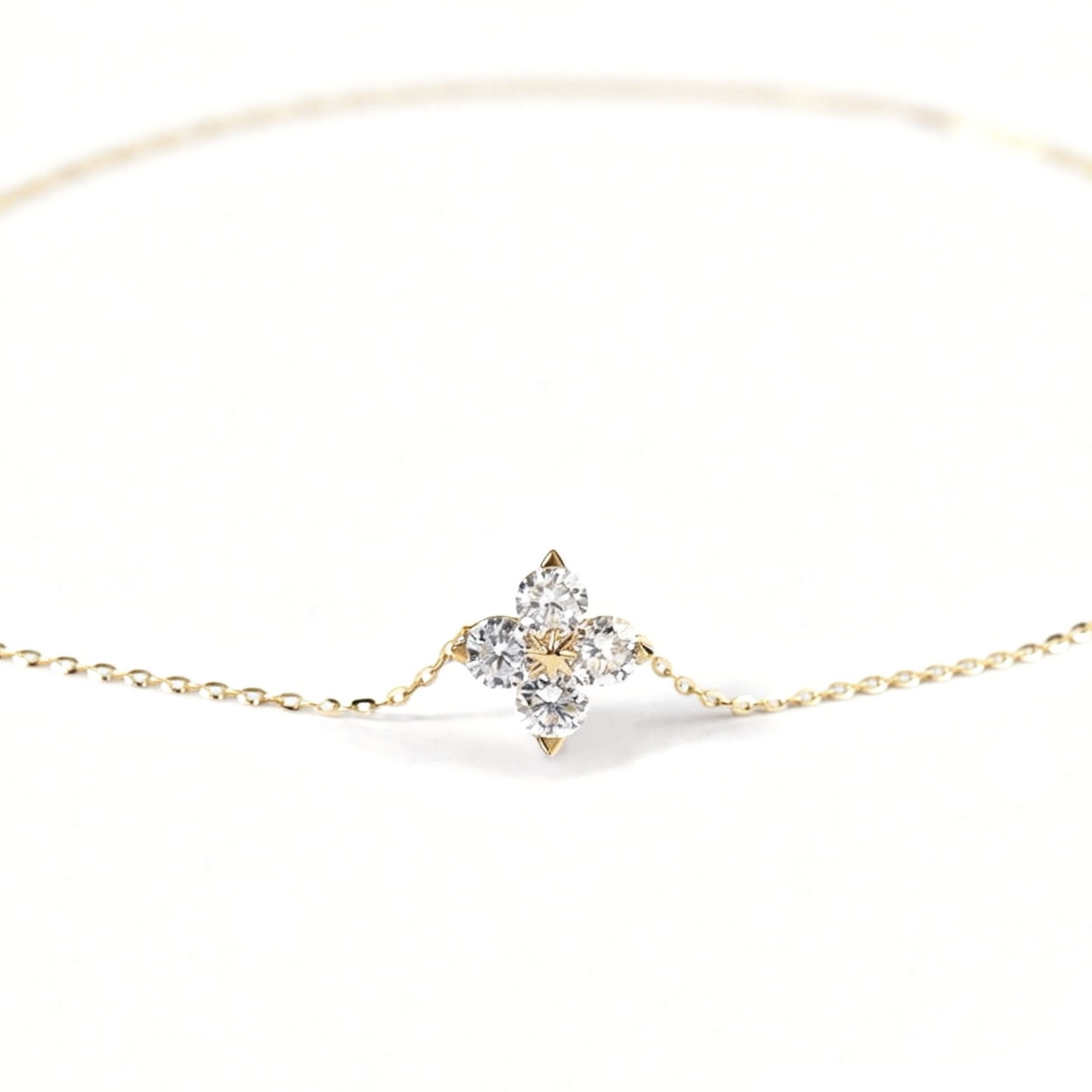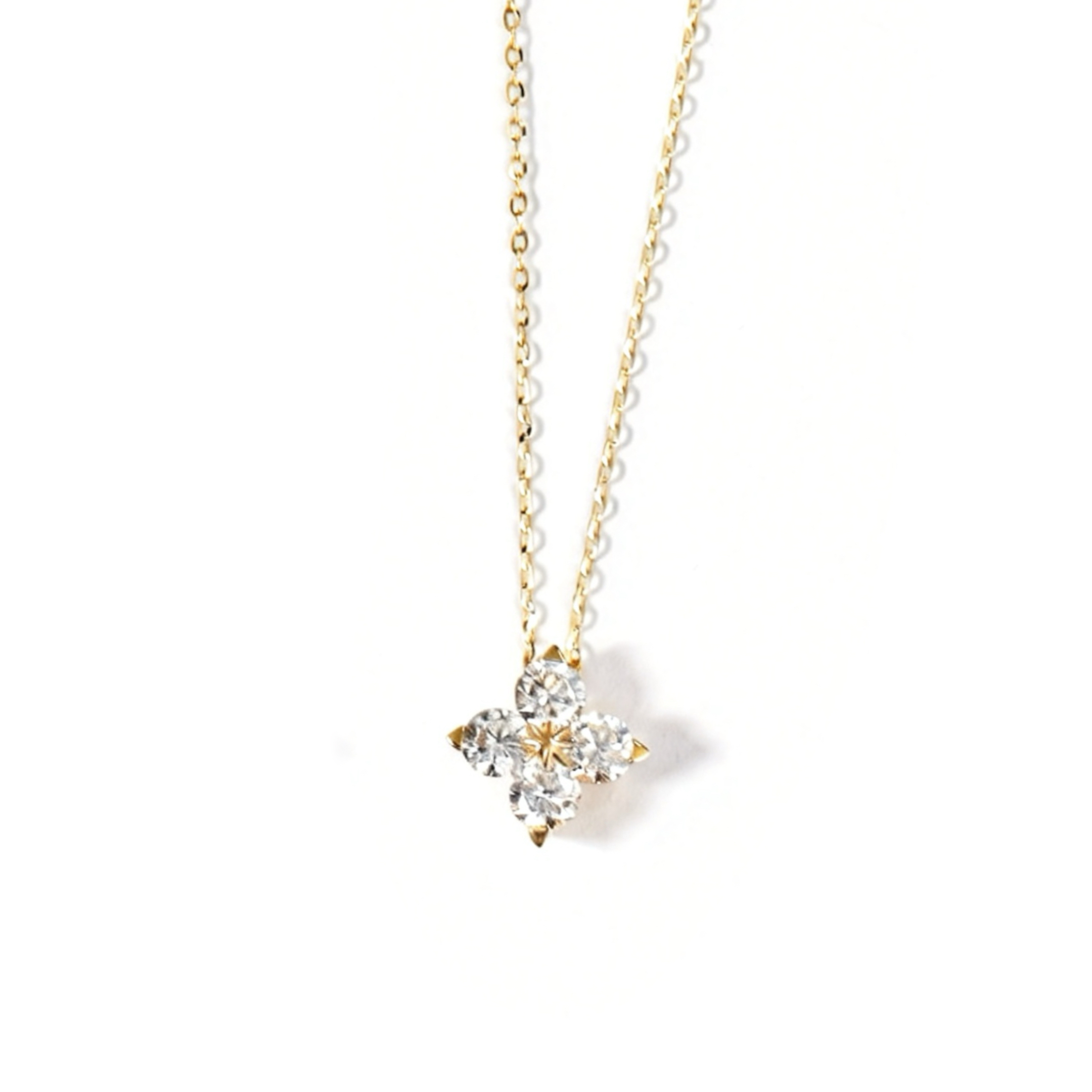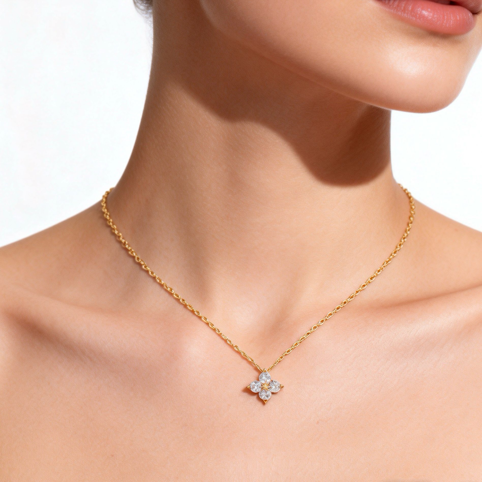 Crafted in luxurious 18K yellow gold, this enchanting necklace features a graceful floral-inspired diamond design, formed by five round brilliant-cut lab-grown diamonds arranged in a radiant blossom silhouette. The carefully balanced setting enhances each diamond’s brilliance, creating a captivating sparkle from every angle. This necklace offers exceptional light and purity. Suspended from a fine gold chain, the elegant floral motif sits beautifully on the neckline, making it perfect for both everyday sophistication and special occasions.