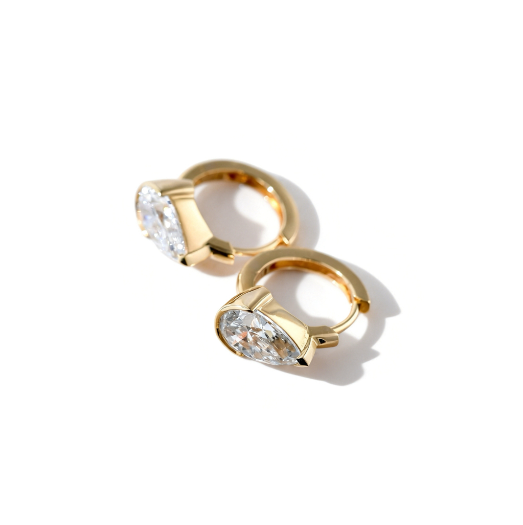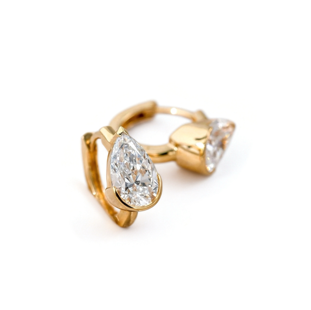 Crafted in radiant 18K yellow gold, these elegant earrings feature striking pear-shaped lab-grown diamonds delicately suspended from polished hoop settings. The graceful teardrop silhouette enhances the diamond’s natural brilliance, creating a refined balance of movement, light, and sophistication. These lab-grown diamonds offer remarkable sparkle and purity while embracing a modern, sustainable approach to fine jewellery. Their timeless design makes them perfect for both everyday elegance and special occasions.
