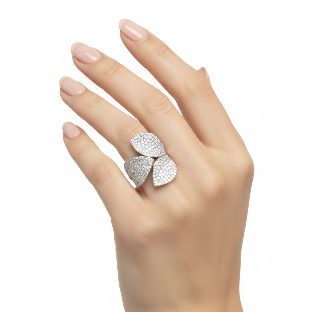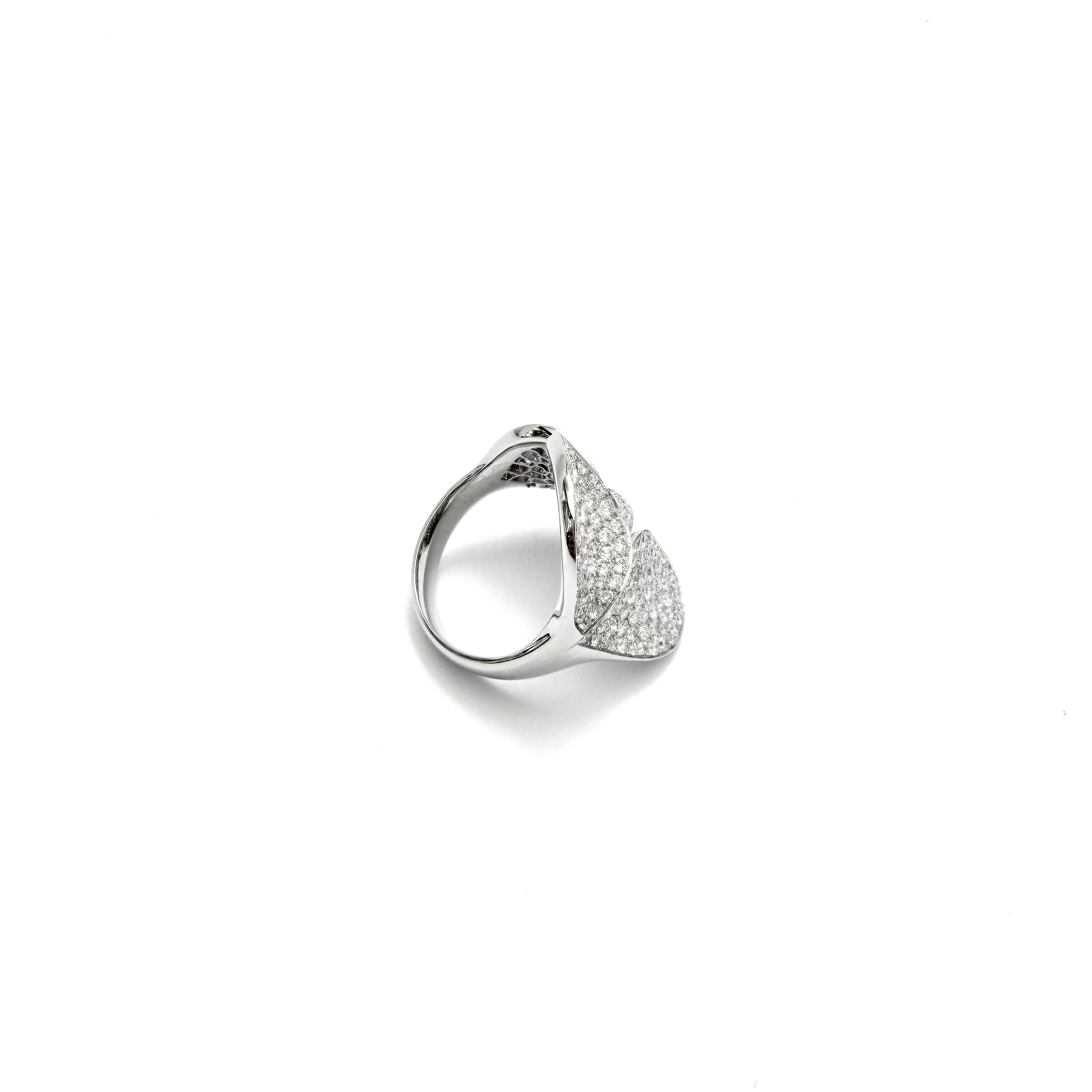 Crafted in luxurious 18K gold, this striking statement ring features an artistic multi-petal design pavé-set with shimmering lab-grown diamonds. Each curved surface is delicately covered in brilliant stones, creating a captivating display of sparkle and texture from every angle. Modern yet timeless, this distinctive piece is designed for those who appreciate refined craftsmanship and confident, sophisticated style.