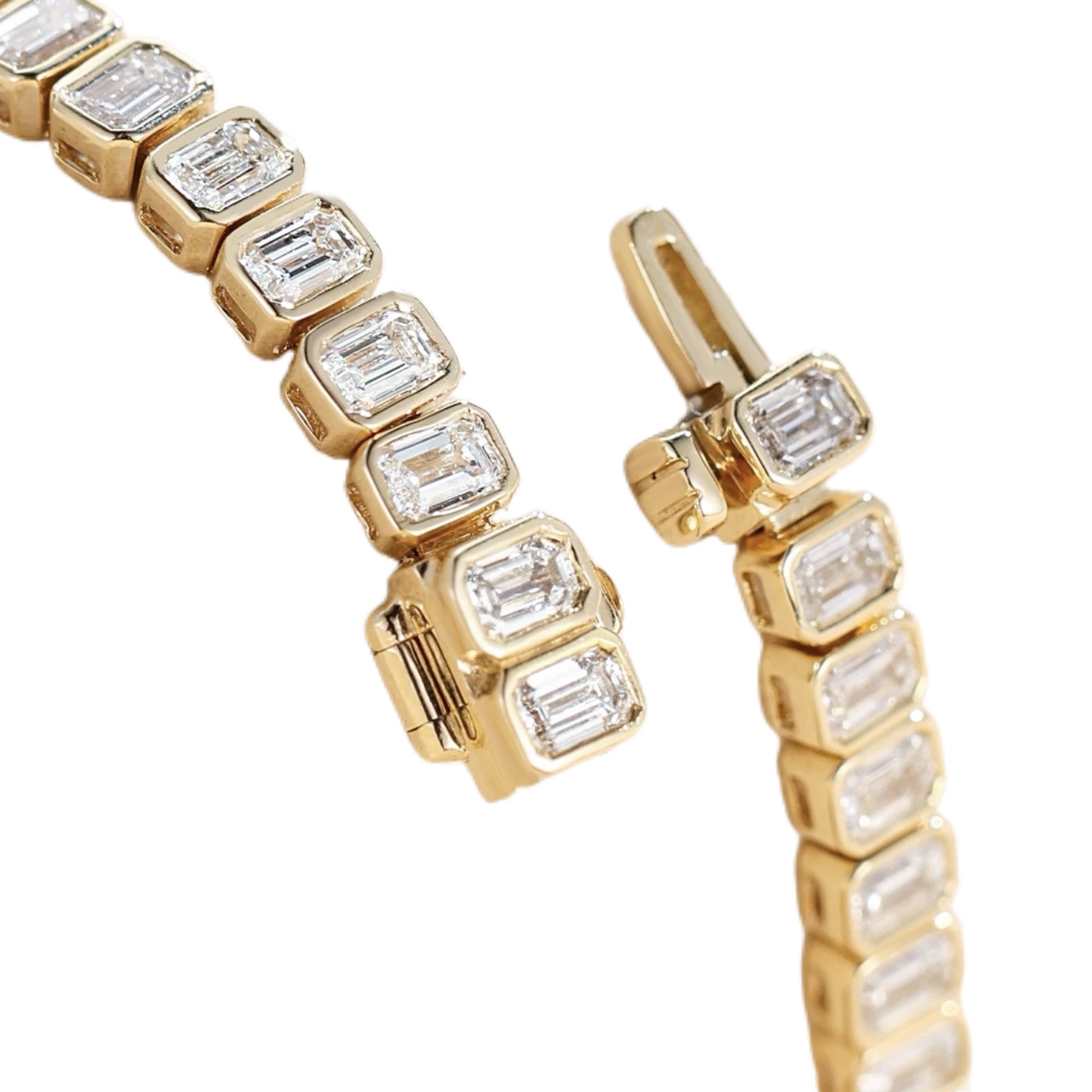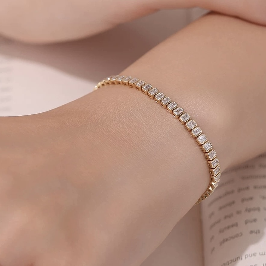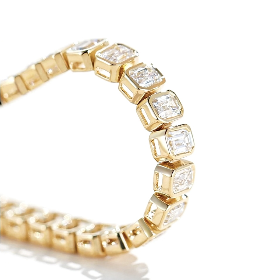 Crafted in luminous 18K yellow gold, this sophisticated tennis bracelet wtih a bezel setting features a continuous line of emerald-cut diamonds, each meticulously set to create a seamless flow of light and symmetry around the wrist. The elongated facets of the emerald cut produce a distinctive mirror-like sparkle, celebrated for its understated elegance and architectural beauty. Set with E colour, VS clarity diamonds, this bracelet delivers exceptional brilliance while maintaining a sleek, contemporary profile. Designed for both everyday luxury and special occasions, it is a piece that effortlessly elevates any jewellery collection.