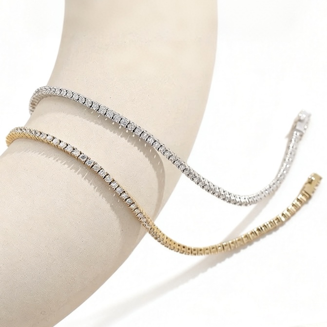 Expertly crafted in 18K white gold, this elegant tennis bracelet features a continuous row of perfectly matched natural round brilliant diamonds, each individually secured to create a fluid line of sparkle. The refined setting enhances the natural fire of every diamond, allowing light to reflect beautifully from every angle. This bracelet represents both superior quality and classic sophistication. Its graceful design sits comfortably on the wrist, making it a perfect piece for both everyday elegance and special occasions. Available in multiple diamond sizes, offering varying levels of brilliance while maintaining the same timeless design