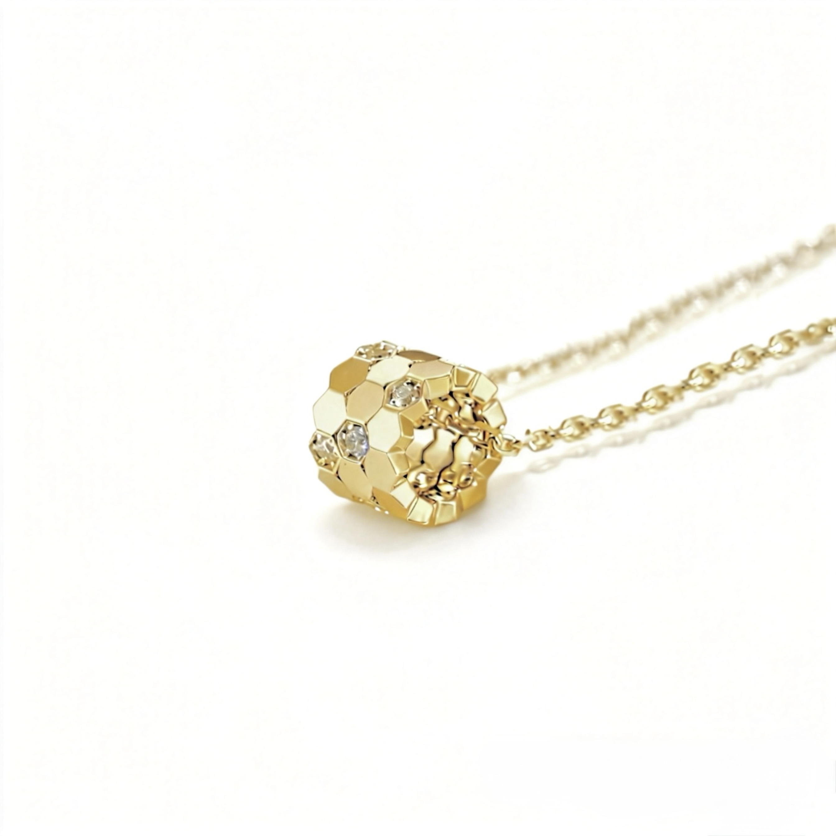 Crafted in luxurious 18K yellow gold, this striking necklace features a sculptural honeycomb-inspired design, beautifully accented with natural diamonds. The geometric hexagonal pattern reflects both strength and harmony, while the polished gold surfaces capture and reflect light to create a warm, luminous glow. With its contemporary character and refined brilliance, this necklace offers a unique statement of sophistication—perfect for those who appreciate jewellery that blends artistic design with timeless luxury.