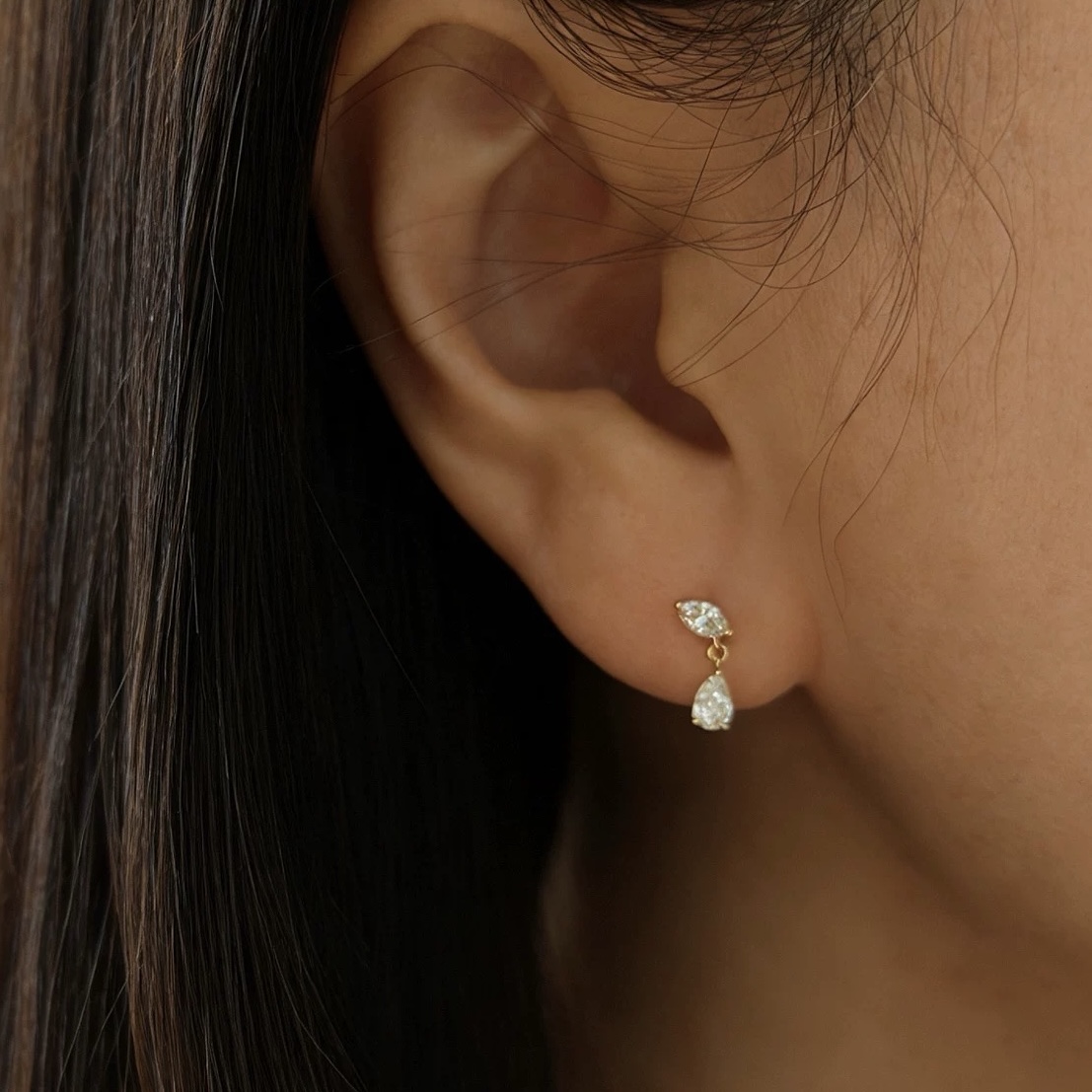 Crafted in 18K gold, these elegant drop earrings feature a refined marquise-cut natural diamond stud, delicately connected to a suspended pear-shaped diamond drop. The harmonious pairing of these two distinctive diamond shapes creates a beautiful sense of balance, allowing the lower diamond to gently move and shimmer with every motion. Sophisticated yet effortlessly feminine, these earrings embody timeless elegance—perfect for elevating both everyday luxury and special occasions.