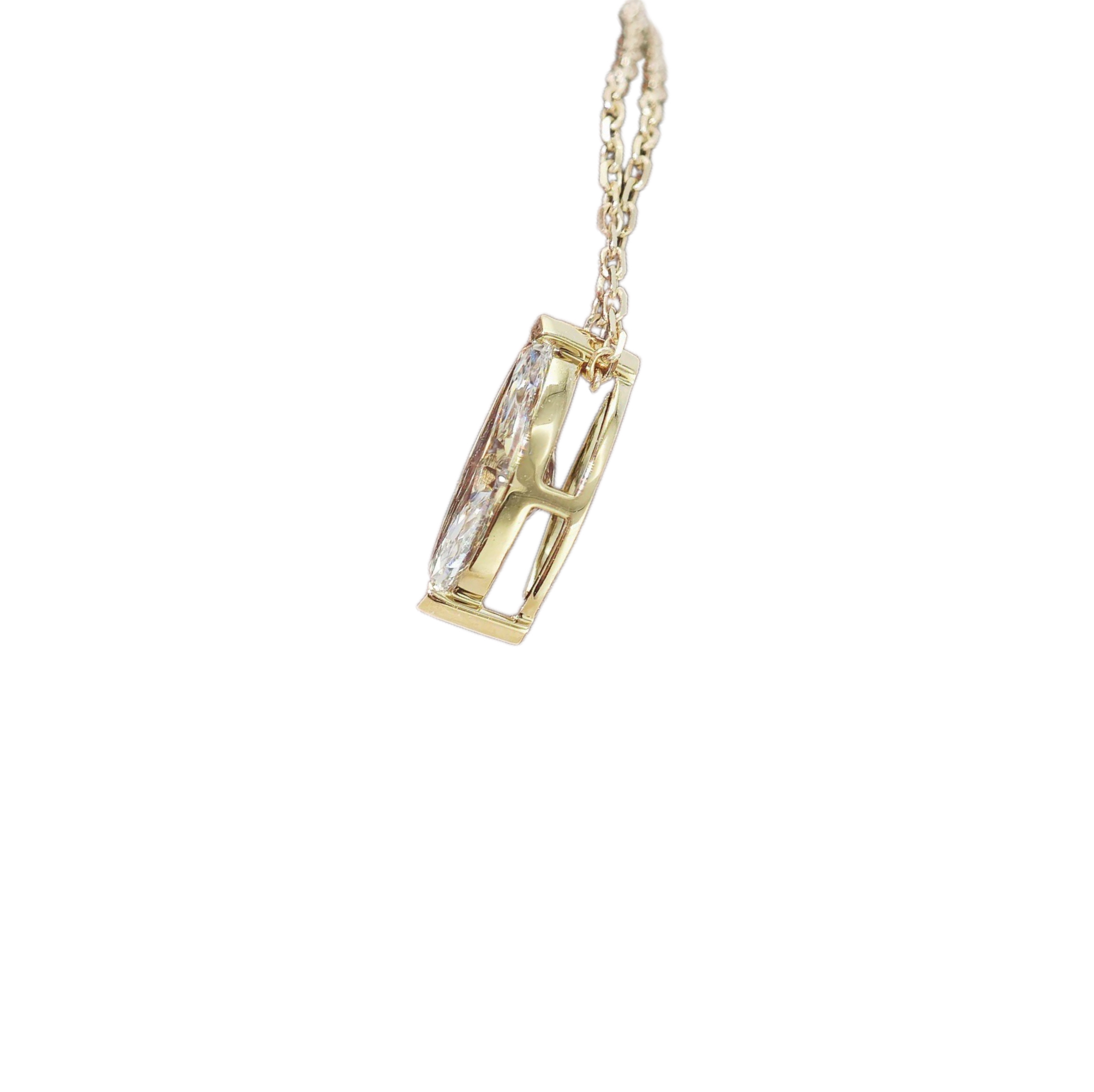 Crafted in luxurious 18K gold, this refined necklace features a captivating marquise-cut natural diamond, celebrated for its elongated silhouette and brilliant sparkle. The delicate setting enhances the diamond’s natural radiance, allowing light to flow effortlessly across each facet while creating a slender and sophisticated profile on the neckline. Elegant yet timeless, this piece is perfect for both everyday refinement and special occasions, offering a beautiful balance of classic design and modern luxury.