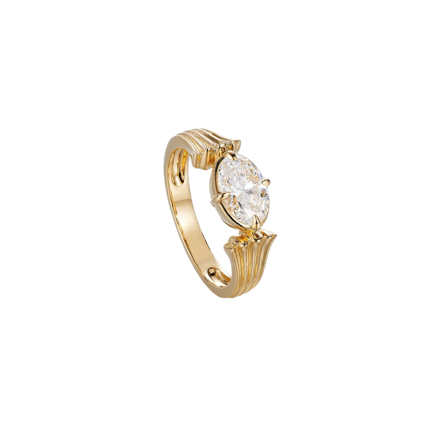 Crafted in rich 18K gold, this striking ring features a luminous round brilliant-cut lab-grown diamond, secured in a distinctive sculptural setting that embodies both strength and sophistication. The textured, flowing band design adds a contemporary edge, creating a powerful yet refined silhouette. This piece delivers remarkable fire and purity—offering the beauty of a high-grade diamond with a modern, conscious approach. Designed for those who appreciate individuality and confident style, this ring is more than jewellery—it is a statement of presence, intention, and refined taste.