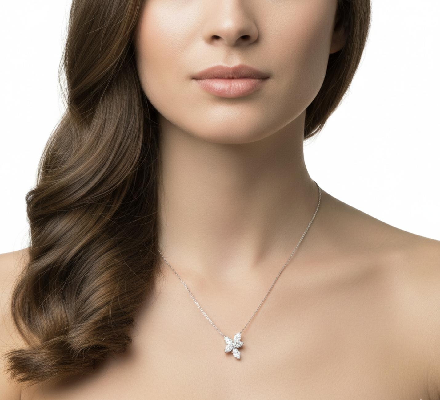 Crafted in 18K white gold, this refined necklace features a striking cluster of lab-grown diamonds arranged in a graceful floral-inspired silhouette. The centre design showcases beautifully cut diamonds that radiate outward, creating a balanced composition that captures light from every angle. Set with 4.31 carats of diamonds across five stones, this necklace offers a bold yet sophisticated sparkle—an exquisite piece designed to elevate both special occasions and timeless everyday luxury.