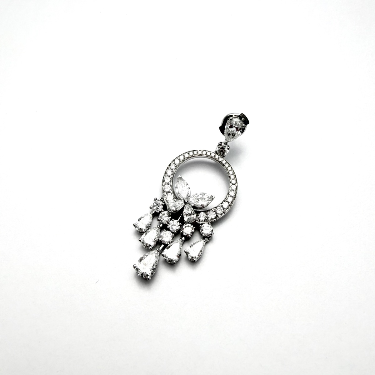 Crafted in 18K white gold, these striking drop earrings feature a luminous diamond halo circle suspended beneath a delicate diamond stud, flowing into a graceful cluster of pear-shaped and round lab-grown diamonds. The refined arrangement creates beautiful movement and light reflection, allowing each stone to sparkle with captivating brilliance, just like a butterfly captiviating movement when flying.
