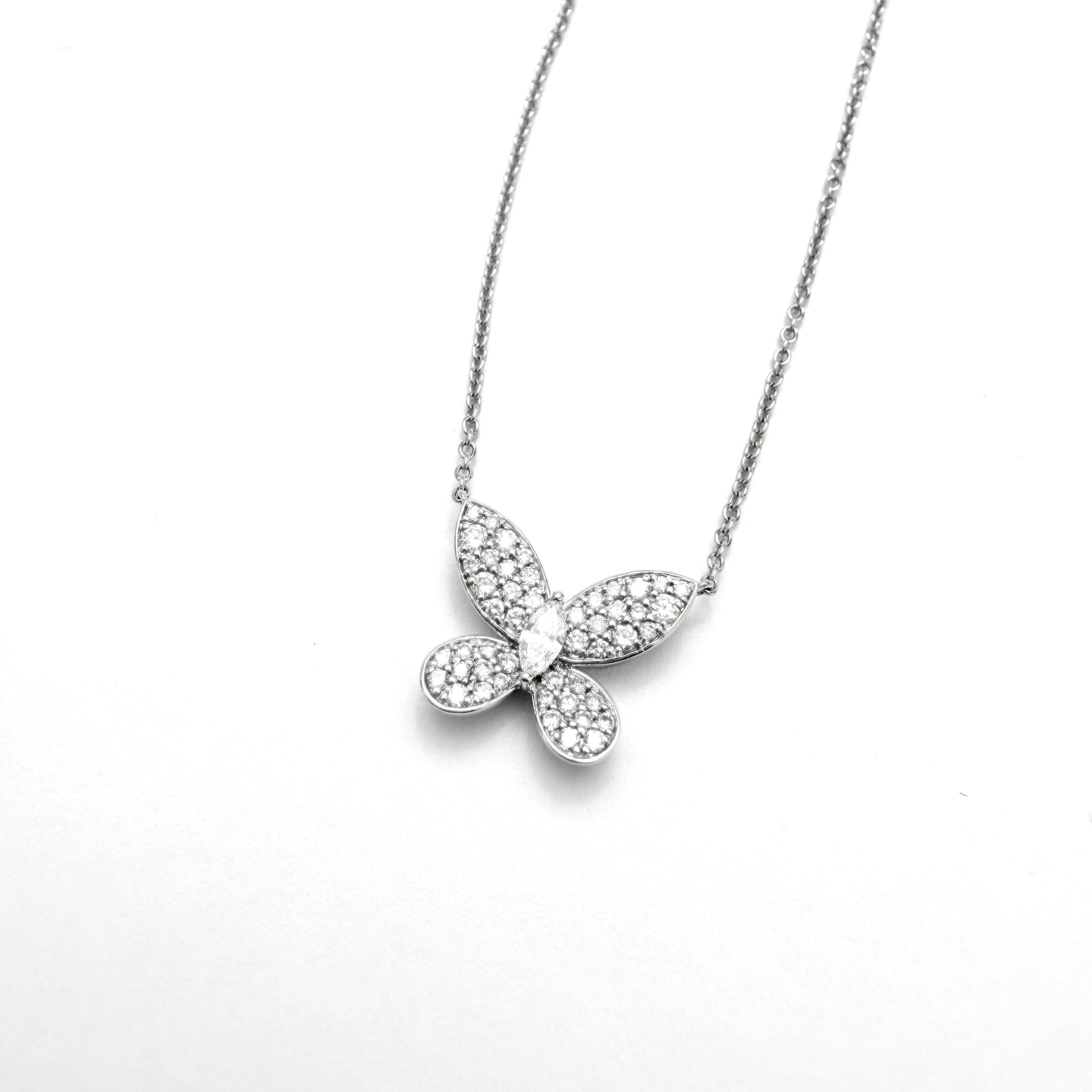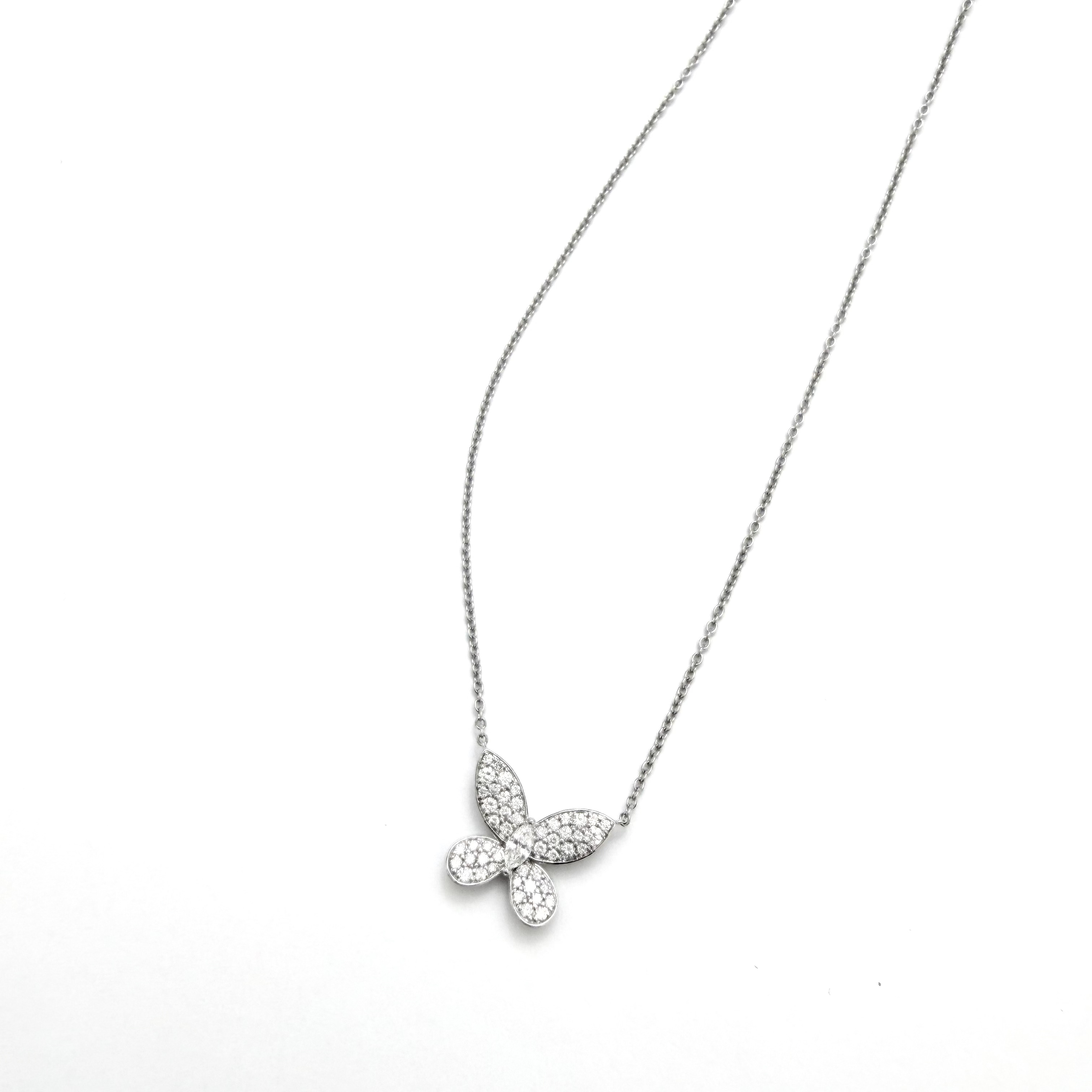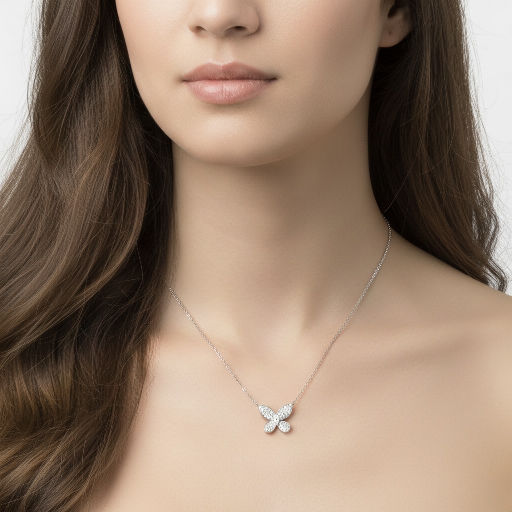 Crafted in 18K white gold, this elegant necklace features a graceful butterfly motif adorned with shimmering lab-grown diamonds. The soft curves of the butterfly wings are beautifully pavé-set, creating a luminous sparkle that reflects light with every movement. Set with 0.55 carats of diamonds across 47 stones, this refined piece offers a perfect balance of charm and sophistication—an enchanting addition to any jewellery collection and ideal for everyday elegance.