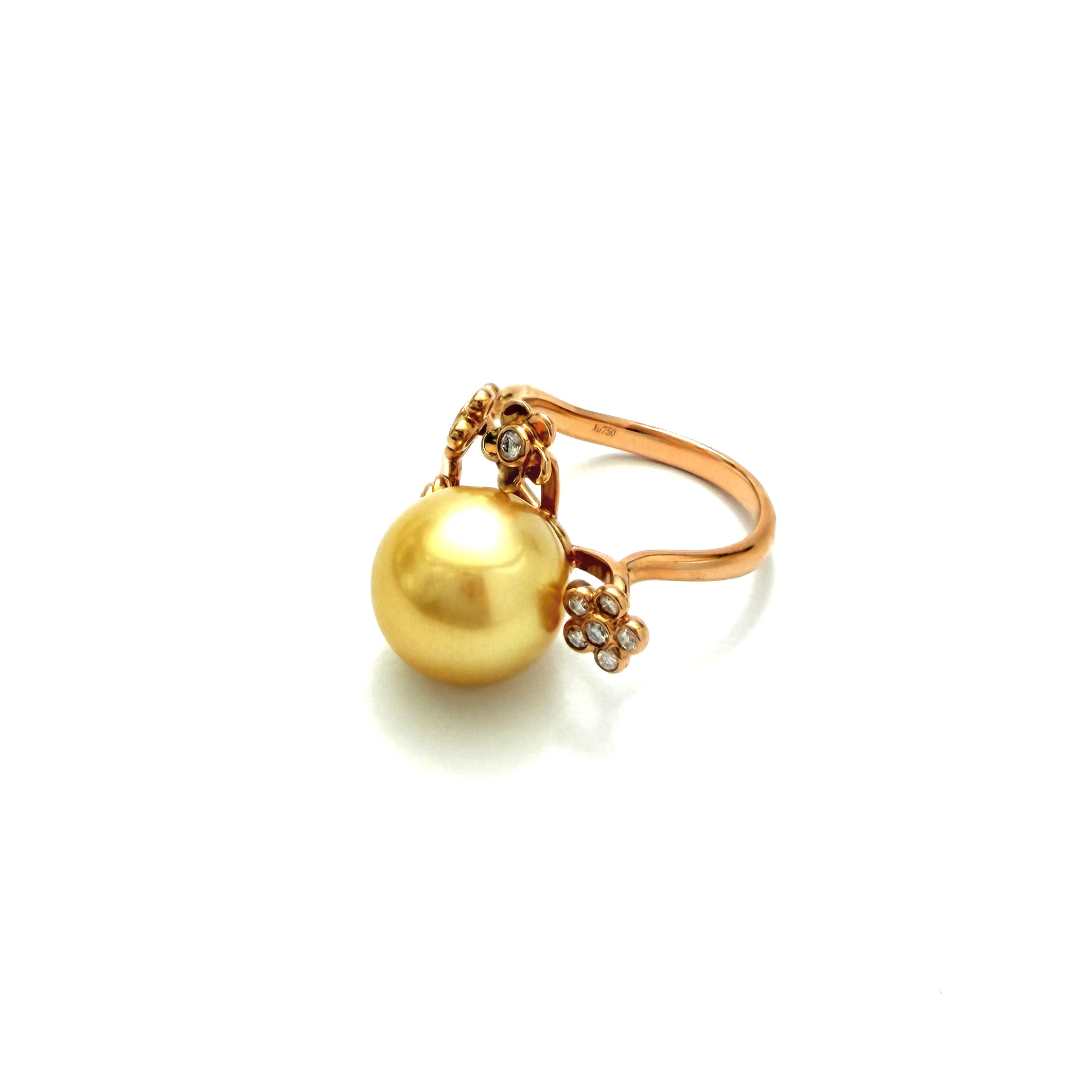 Centred with a luminous South Sea pearl, this ring celebrates the natural beauty and prestige of one of the world’s most coveted pearls. Its rich golden tone glows with a satin lustre, commanding attention while maintaining timeless elegance, all whilst been in the centre of flowers with diamonds set in gold. Inspired by natural beauty of the world. Crafted in solid 18K gold, the design is enhanced with delicate diamond accents (0.25ct total), arranged in soft floral-inspired detailing that adds brilliance and dimension without overpowering the pearl’s natural presence.