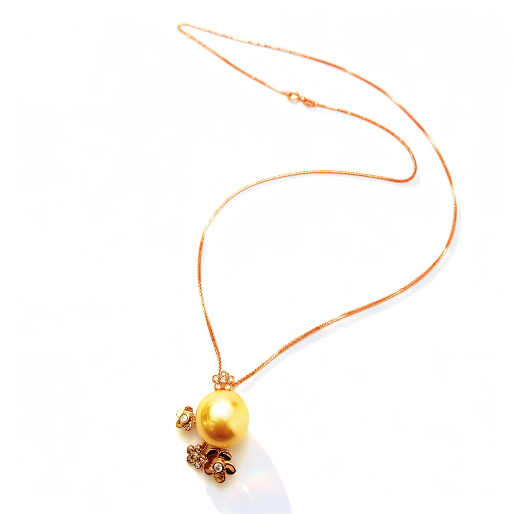 This elegant pendant showcases a magnificent South Sea pearl, admired for its generous size and signature satin glow. Its rich golden tone reflects warmth and light with every movement, creating a soft yet striking presence against the skin. Crafted in solid 18K gold, the pearl is gracefully accented with delicate floral diamond detailing (0.208ct total), adding subtle brilliance without distracting from the natural beauty of the pearl. The sculpted gold setting enhances the organic elegance of the design, blending refinement with gentle romance.